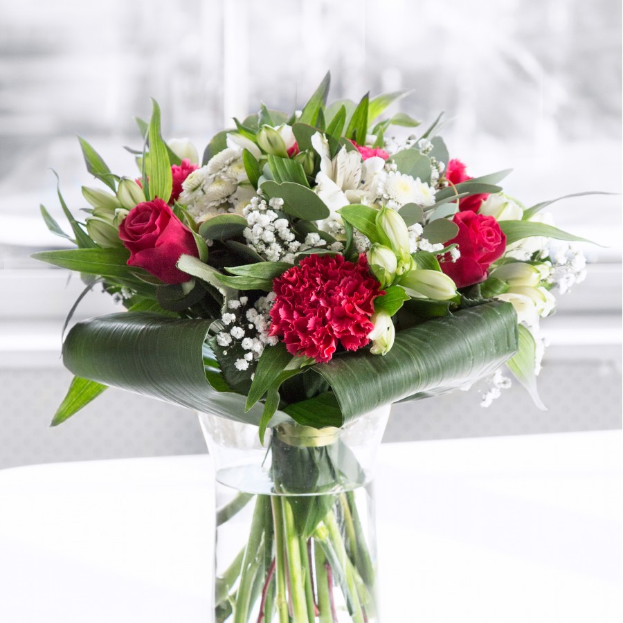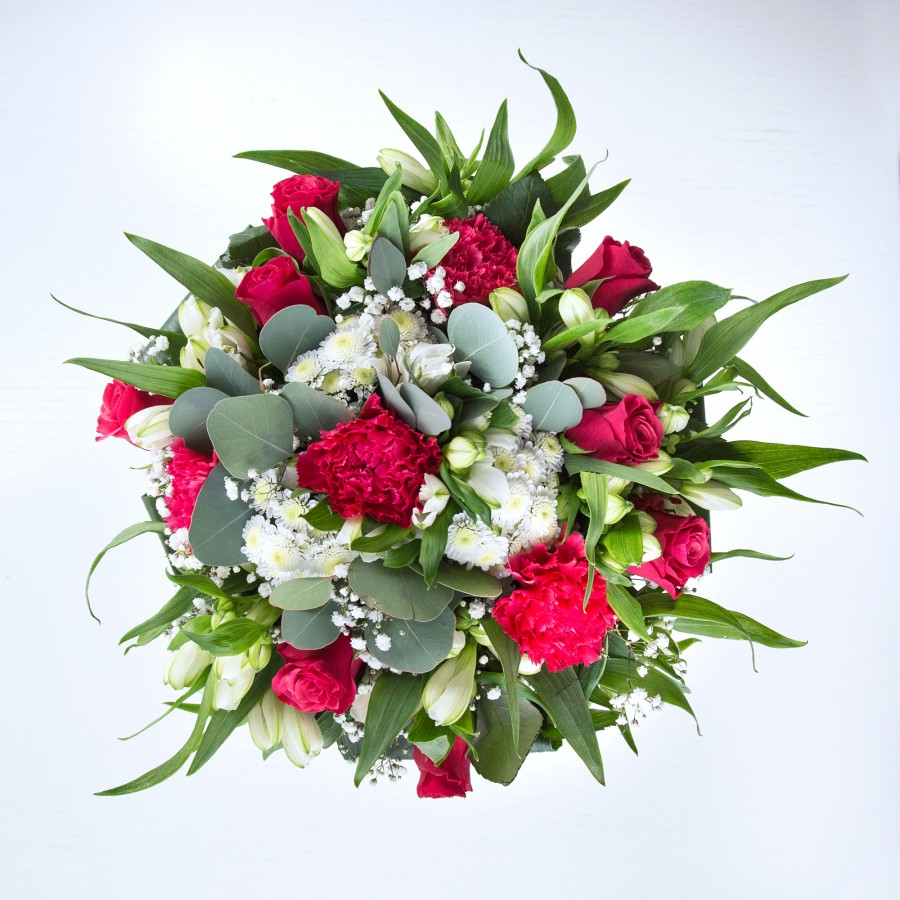 Experience an artful display of nature with our luxurious bouquet. This charming arrangement combines white chrysanthemums, delicate gypsophila, radiant red roses, cheerful carnations, white alstroemeria, and lush aspidistra leaves into one harmonious composition that speaks to the soul.